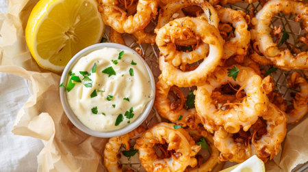 A top-down view of a pile of freshly grilled calamari rings, crispy and golden brown, served with aioli dipping sauce and lemon wedges