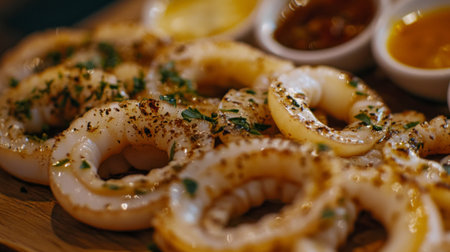 Delicious grilled seafood rings garnished with herbs and spices, served with dipping sauces on a wooden platter. Perfect for a summer feast or gourmet dining experience.