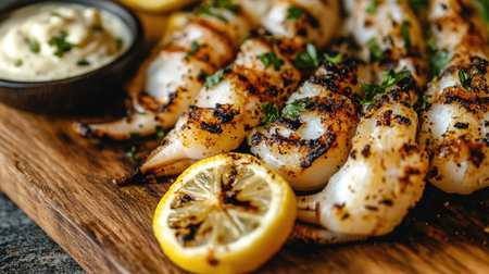 A close-up of grilled squid served on a rustic wooden board, with a side of garlic aioli and a garnish of fresh lemon slices and herbs.