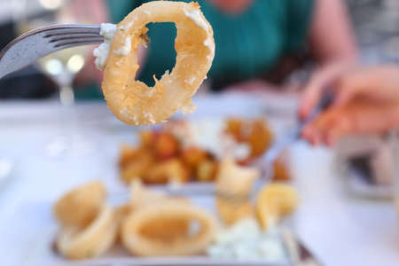 Deep fried squid fried calamari rings, grilled kalamaria tiganita, a traditional Mediterranean food served in tavern, Corfu, Greek islands, Ionian sea, Greece