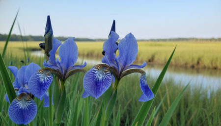 Wild iris flowers grow along rivers edge at a slough