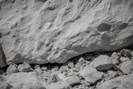 Close-up shot of rough stone textures in a quarry with machinery in the background. AI generated.