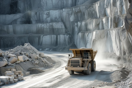 Quarrying of marble at marble quarry is being worked on by heavy large truck Generative AI