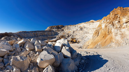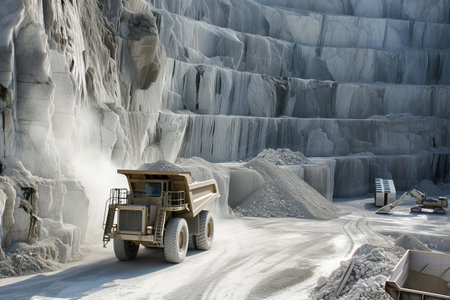 In marble quarry, heavy excavators, bulldozers, a large truck are at work Generative AI
