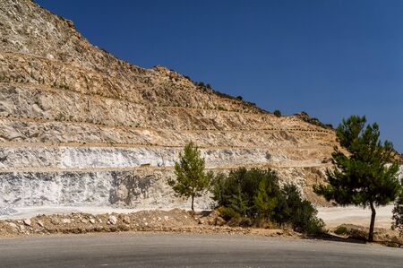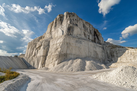 Natural white marble quarry under clear blue sky in bright sunlight.