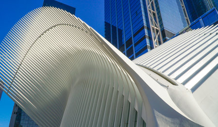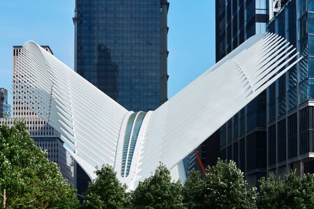 New York, United States of America - September 19, 2019: Exterior view of the roof structure of the World Trade Center train station, also called Oculus