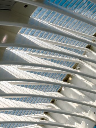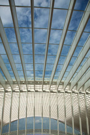 Beautiful abstract view of the interior of the modern architecture railway station Liege-Guillemins with steel shapes and lines in Belgium