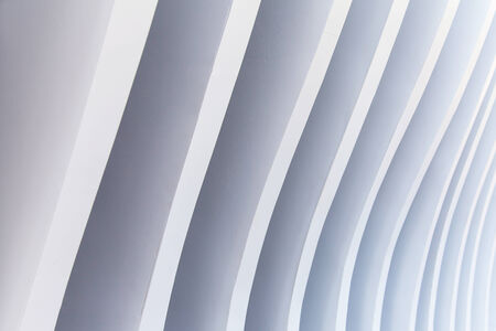 An abstract architectural ceiling features repeating curved white ribs creating a symmetrical ribbed pattern.