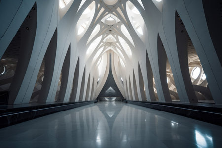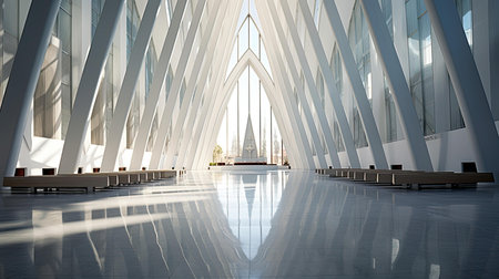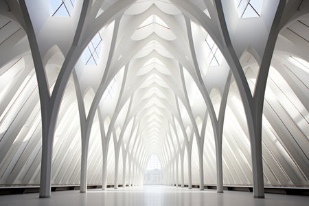 The interior features a stunning array of curving white structures, allowing natural light to flood the space, creating a serene and modern atmosphere.