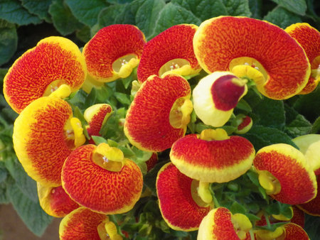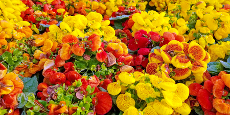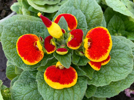 Beautiful red-yellow flowers of Calceolaria in the flowerbed close up