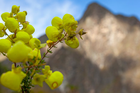 Yellow Slipper (Calceolaria) flowers on the mountains background, Andes, Ollataytambo, Peru