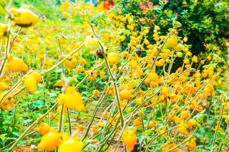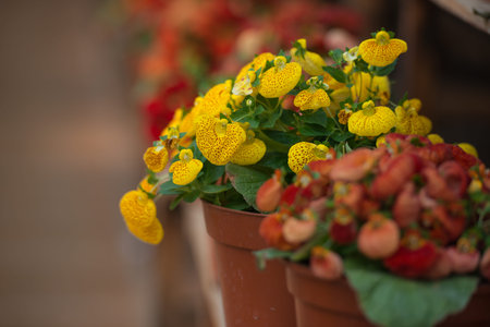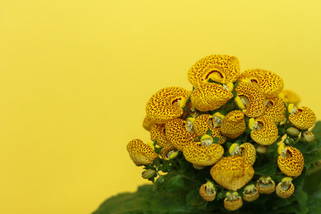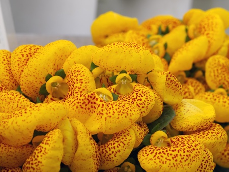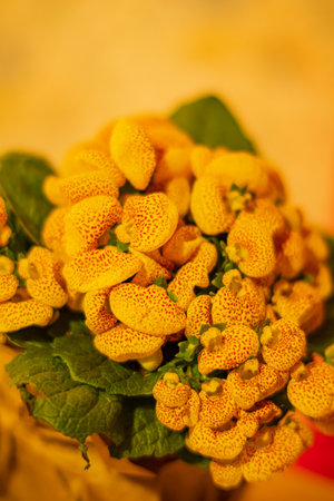 a lot of flowers of yellow house plant calceolaria, note shallow depth of field
