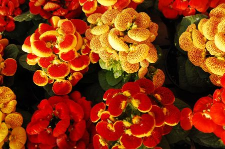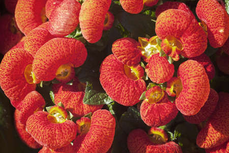 a lot of flowers of red house plant calceolaria, note shallow depth of field