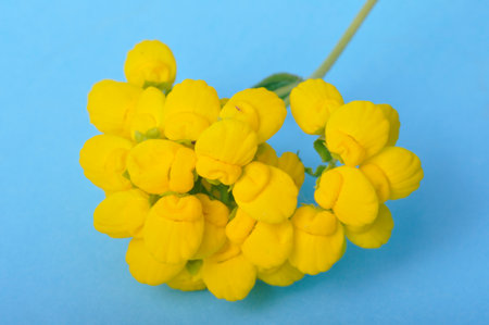 Yellow Calceolaria, also called lady's purse, slipper flower and pocketbook flower, or slipperwort, close up. Shallow depth of field. Selective focus.