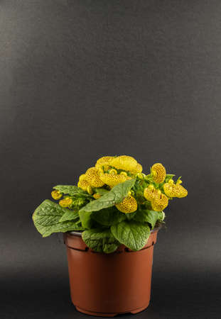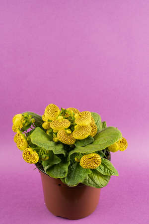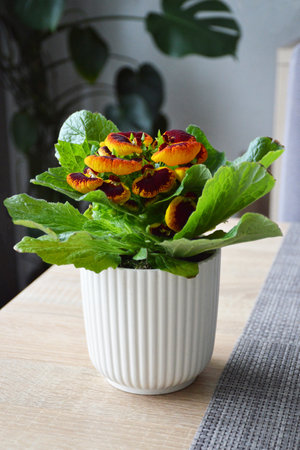 Potted slipper flower on the table. Close up of Calceolaria plant.