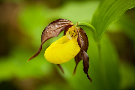 Cypripedium calceolus. This orchid is found in the Czech Republic at approximately 100 localities, in Bohemia and Moravia. A very rare plant. Wild nature. Free nature. Spring. Lady`s Slipper Orchid, C