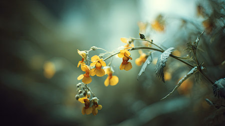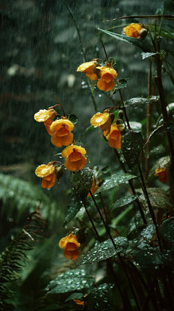 Calceolaria in a storm, heavy rain pouring down, strong winds twisting their leaves, natural.