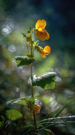 A sunlit portrait of a single Calceolaria, photographed outdoors on a clear, breezy day. Fresh, crisp air renders vivid detail in the leave veins glowing with gentle backlight. The background falls into a soft natural bokeh of greenery, colors truetolife, organic beauty in pure sunlight.