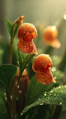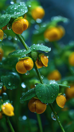 Calceolaria in gentle light rain, soft raindrops visible on vivid green leaves, natural realistic style, bright fresh colors, balanced wide composition, cinematic framing, highly detailed.