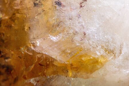 Raw specimen of quartz crystal stone. Citrine gem crystals geological mineral background. selective focus