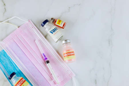 Vaccine vial SARS-Cov-2 injection prevention immunization of COVID-19 vaccines on medical syringe injection and protective surgical mask