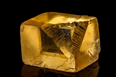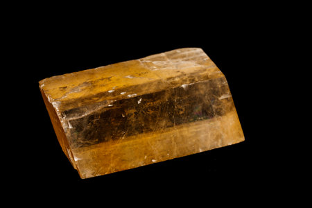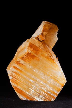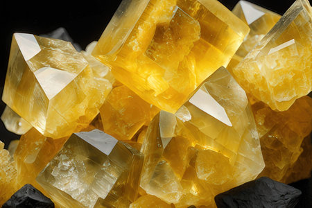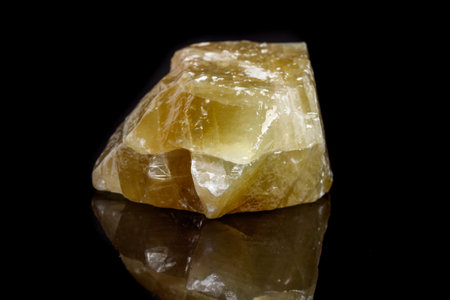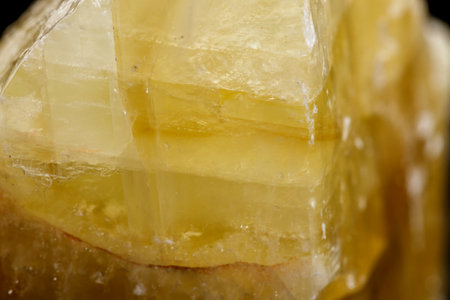 Macro mineral stone yellow Calcite on a black background close up