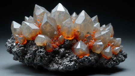 Orange quartz crystals on rough rock surface