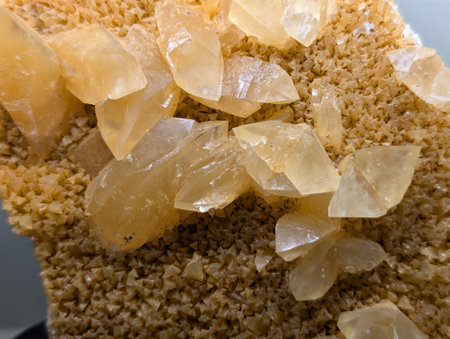 Raw specimen of quartz crystal stone. Citrine gem crystals geological mineral background. selective focus