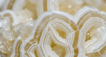 An extreme macro photograph reveals the intricate, layered patterns inside a banded calcite or aragonite crystal. The beautiful translucent and white bands form a stunning natural abstract texture, showcasing the world of geology and minerals.