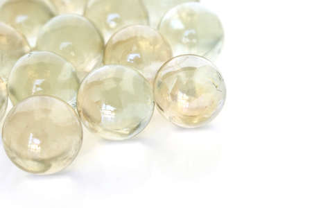 yellow transparent capsules omega 3 lie on a white background. healthy food concept