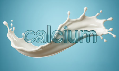 Dynamic milk splash with a transparent 3D word calcium on a blue background, symbolizing strong bones, health, and essential nutrition for a balanced diet.