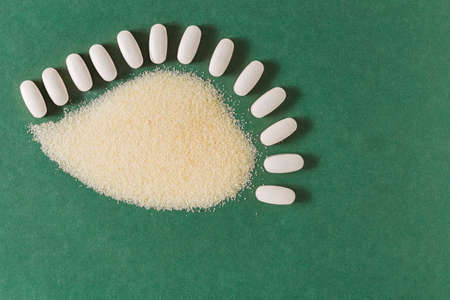 Hydrolyzed and co-compressed collagen on green background, top view