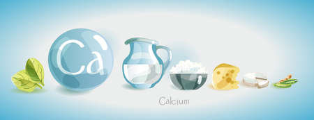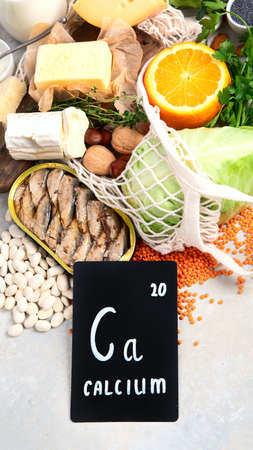 Calcium. Natural organic products with a high content of trace element and calcium symbol on a modern background with polygonal elements.