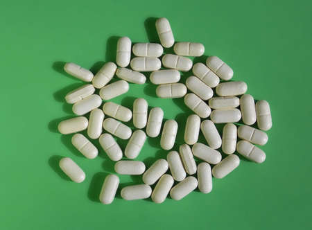 Pile of white pills on green background. The upper angle of view. The concept of dietary supplements.