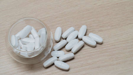 Pills and vitamins for health on the table. Medications to treat