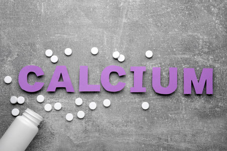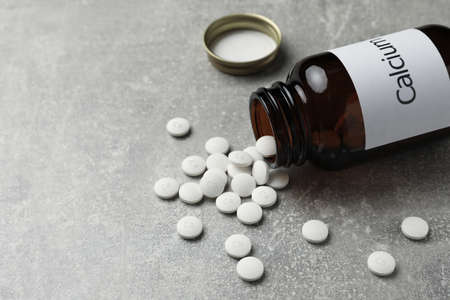 Overturned bottle of calcium supplement pills on gray table. Space for text
