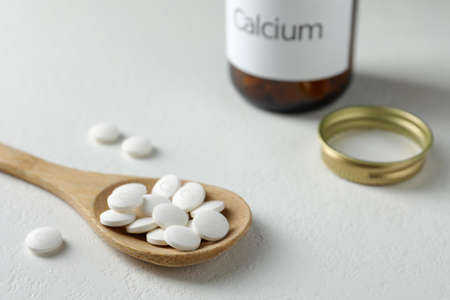 Calcium supplement pills on white table, closeup