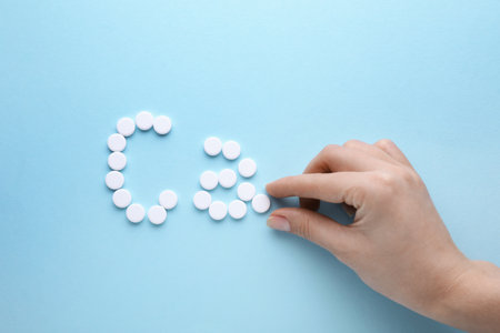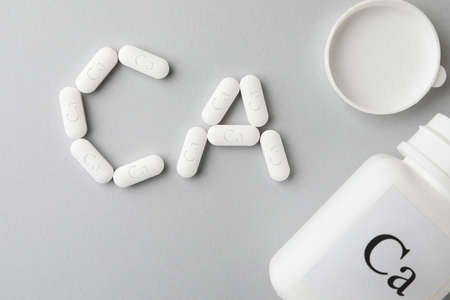 Calcium Tablets. White pills forming shape to Ca alphabet on blue