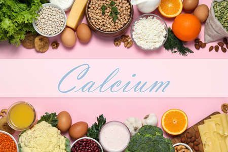 Different fresh products with high amounts of easily absorbable calcium on pink background, flat lay