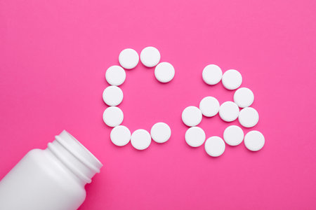 Calcium symbol made of white pills and open bottle on pink background, flat lay