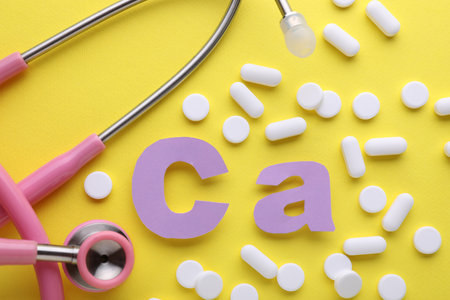 Stethoscope, pills and calcium symbol made of purple letters on yellow background, flat lay