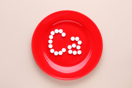 Plate with calcium symbol made of white pills on beige background, top view