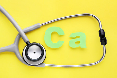 Stethoscope and calcium symbol made of green letters on yellow background, flat lay