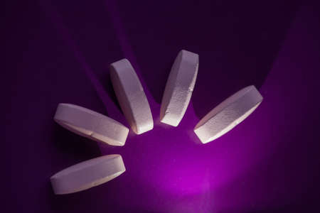 Long pink pills on the purple background. Medicine and healthcare concept.