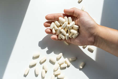 Hands of doctor holding a lot of medicine vitamin capsules or pills. Healthcare or medical concept.