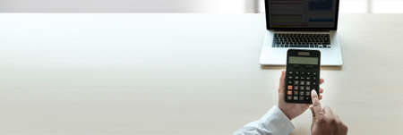 At the accounting desk, an accountant presses a calculator to analyze investment charts to generate monthly financial reports or company profits.