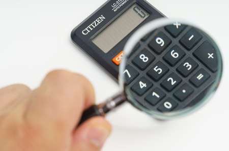 Business and finance concept. The magnifying glass looks at the dial of the calculator.