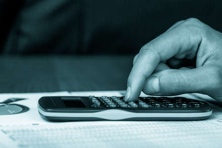 Businessman using a calculator to calculate numbers on a company's financial documents, he is analyzing historical financial data to plan how to grow the company. Financial concept.