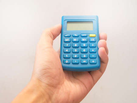 Hand holding Pink calculator on blue background. minimalism. creative layout. fresh ideas.