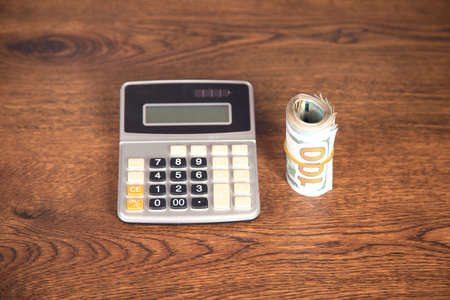 dollar and calculator on the wooden table